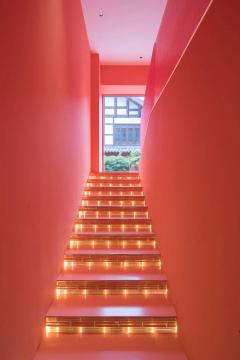第一幕旨在铺陈。进入楼梯间,与寺庙正对的超大比例外凸窗将人的视线一直延伸至寺庙内建筑上,楼梯间墙、顶、地面的珊瑚珠红如寺庙围墙的延续,与寺庙产生对话。