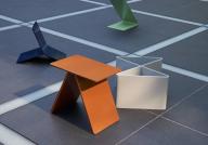 这个装置也是对折叠金属的一次实验探索,打造出一套排版系统,设计师受到Bruno Munari的照片《 Seeking Comfort in an Uncomfortable Chair 》(1944);Max Bill和Hans Gugelot的《Ulm stool》(1955);以及Bruce McLean的Pose作品(1970s)启发,创造出了这一系列设计。其中每把椅子都被涂上了不同的颜色,这些涂料都采用工业金属制品的专用涂料,颜色选择丰富多样,从“国际橙”(曾用于旧金山的金门大桥)到“矢车菊蓝”(曾用于米德尔斯堡的运输桥)都应用到了作品中。