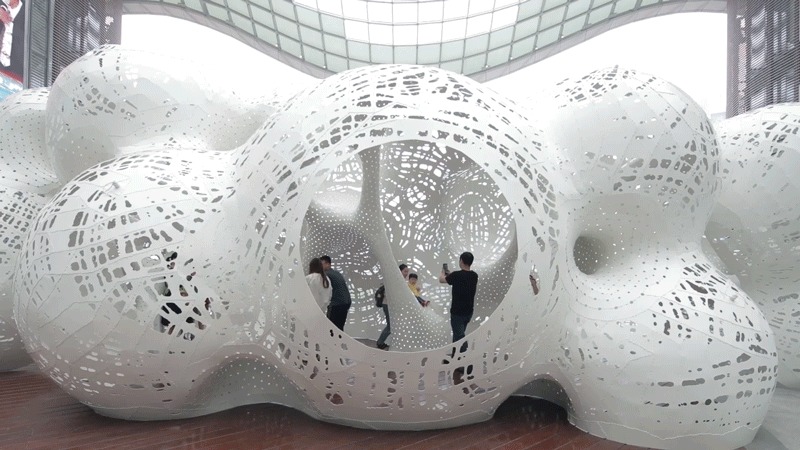 为了金鸡湖双年展,MARCFORNES/THEVERYMANY 在苏州市中心设置了一个大型的户外临时构筑物。这座构筑物起伏的外表预示了其不同于常规的交通,它是设计师打造的一个出人意料的新兴的环境。它似乎是从地里冒出的泡泡,又让人觉得它是从天而降的。这个庞大的白色铝制结构,却因为精妙的设计使得其依靠超薄的边缘轻盈得立在地上。