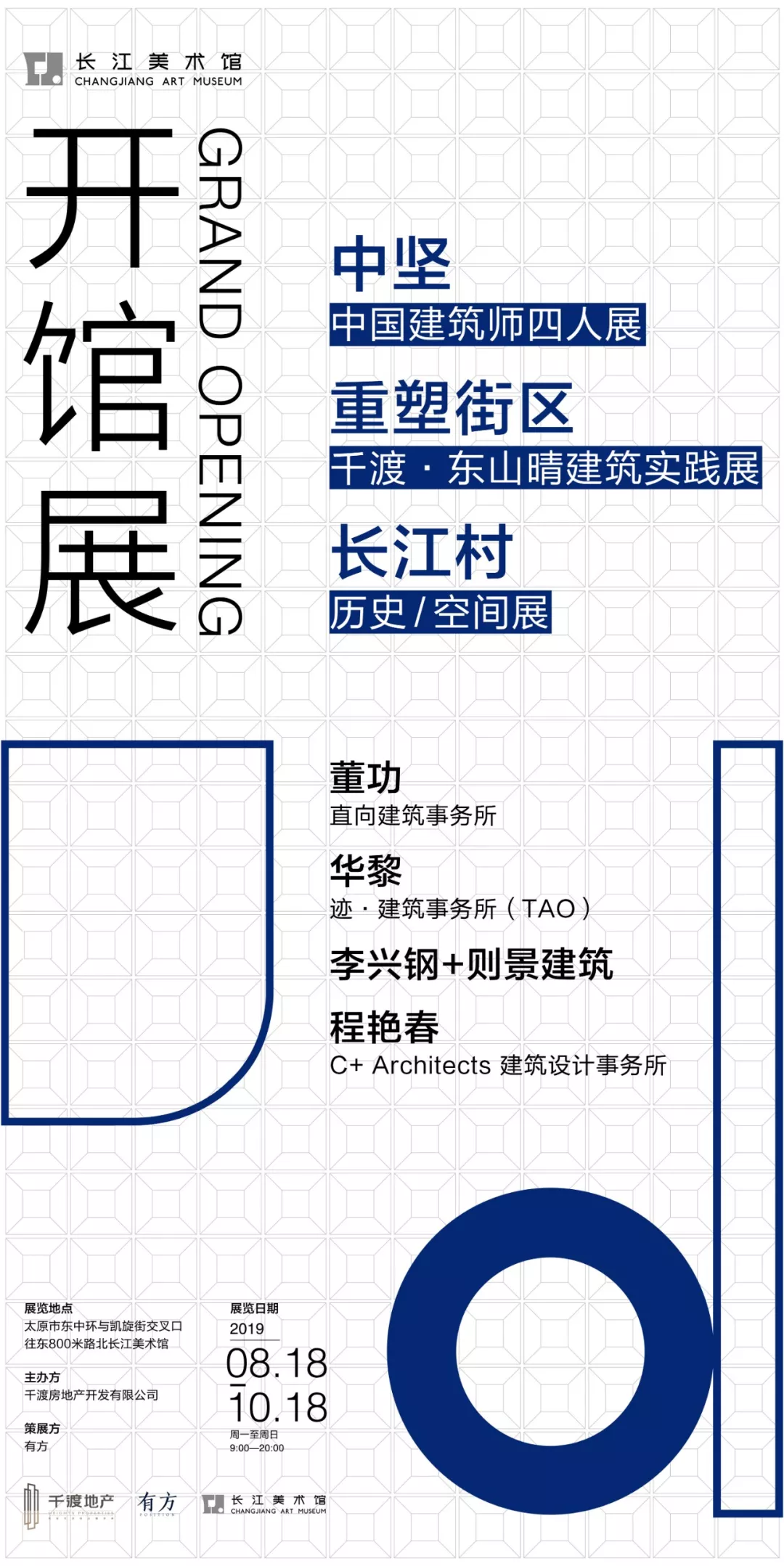 开馆展由“中坚:中国建筑师四人展”、“重塑街区:千渡·东山晴建筑实践展”、“长江村:历史/空间展”三个分展览组成,并将同期举办参展建筑师演讲和学术论坛。这是董功/直向建筑的最新文化建筑长江美术馆的正式亮相,展期将持续至2019年10月18日。