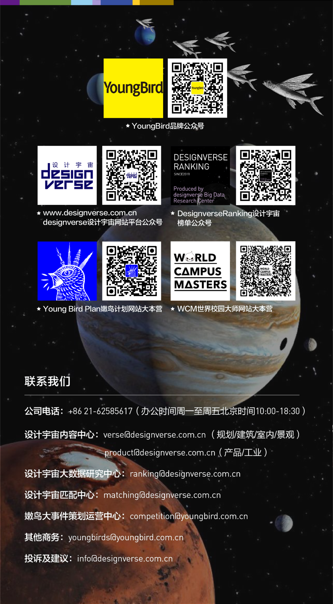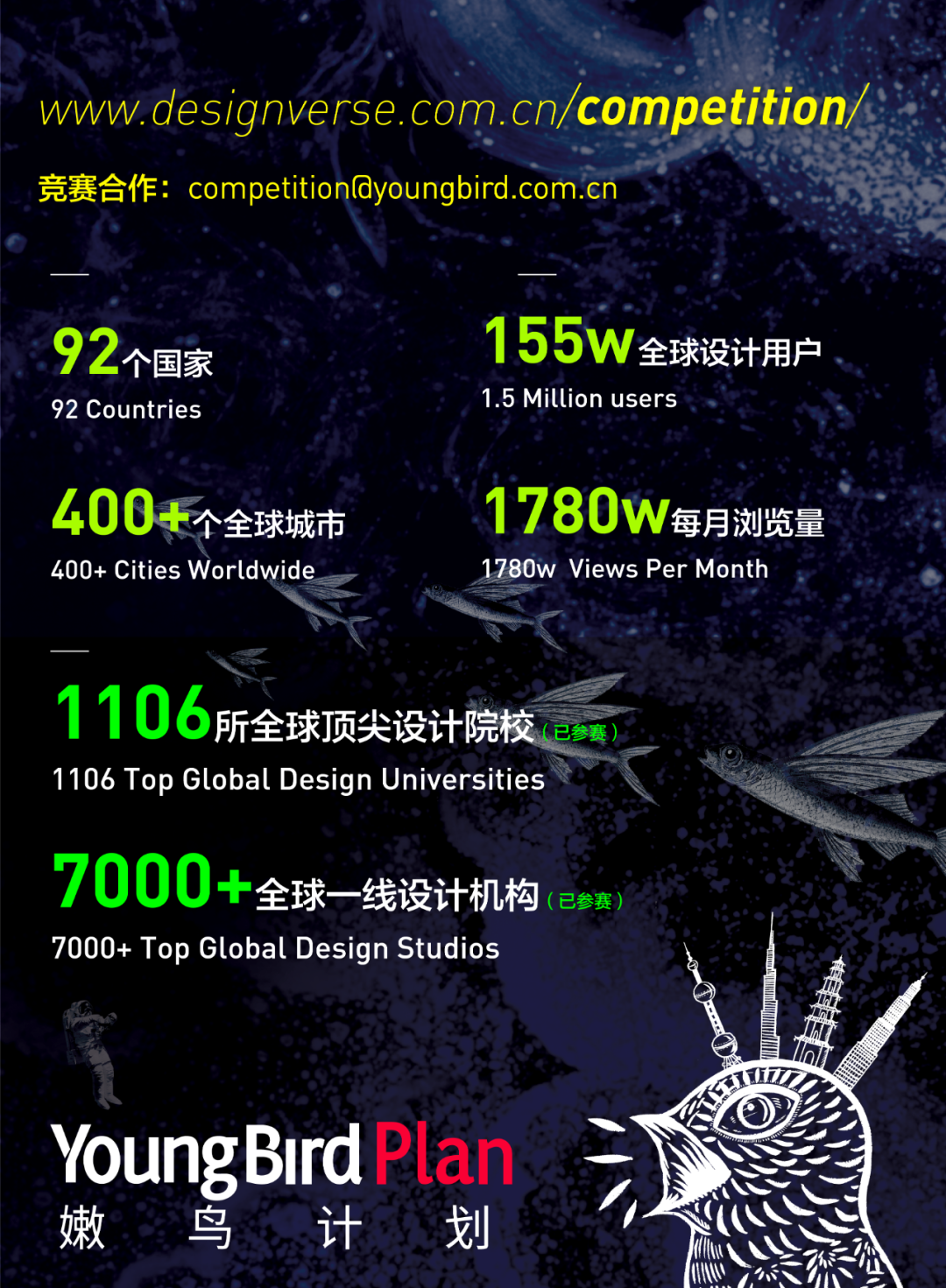 For the latest information about this Competition, please follow our official WeChat account: designverse设计宇宙 or our official Weibo account: @YoungBirdPlan;