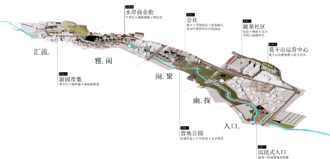 阜溪莫干山镇段位于莫干山集镇的中心,多年来因为道路交通为主要进入方式而成为了小镇的“背面”。水街,是打开莫干山的正确方式,她的建设初衷就是让人们在进入到莫干山区域、到达集镇的时候,可以通过打开的空间,与溪流亲近,通过错落的视廊,望见最近的山峦,未来的水街将聚集起整个区域80%的城市级配套,吸引除了观光度假游客之外的专业工作者、创业者、经营者长期驻留、工作并生活在这里,由此这里将成为整个莫干山未来新产业的聚集地,越来越多各领域的顶尖人士会通过各种节日、竞赛、活动、论坛……参与进来,用“+群”的方式组织起来,一起共创和引领莫干山下一个二十年的区域发展。
