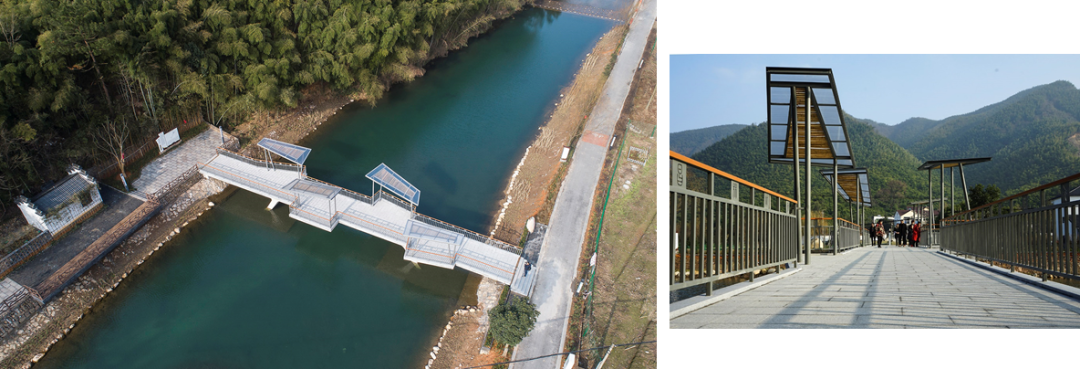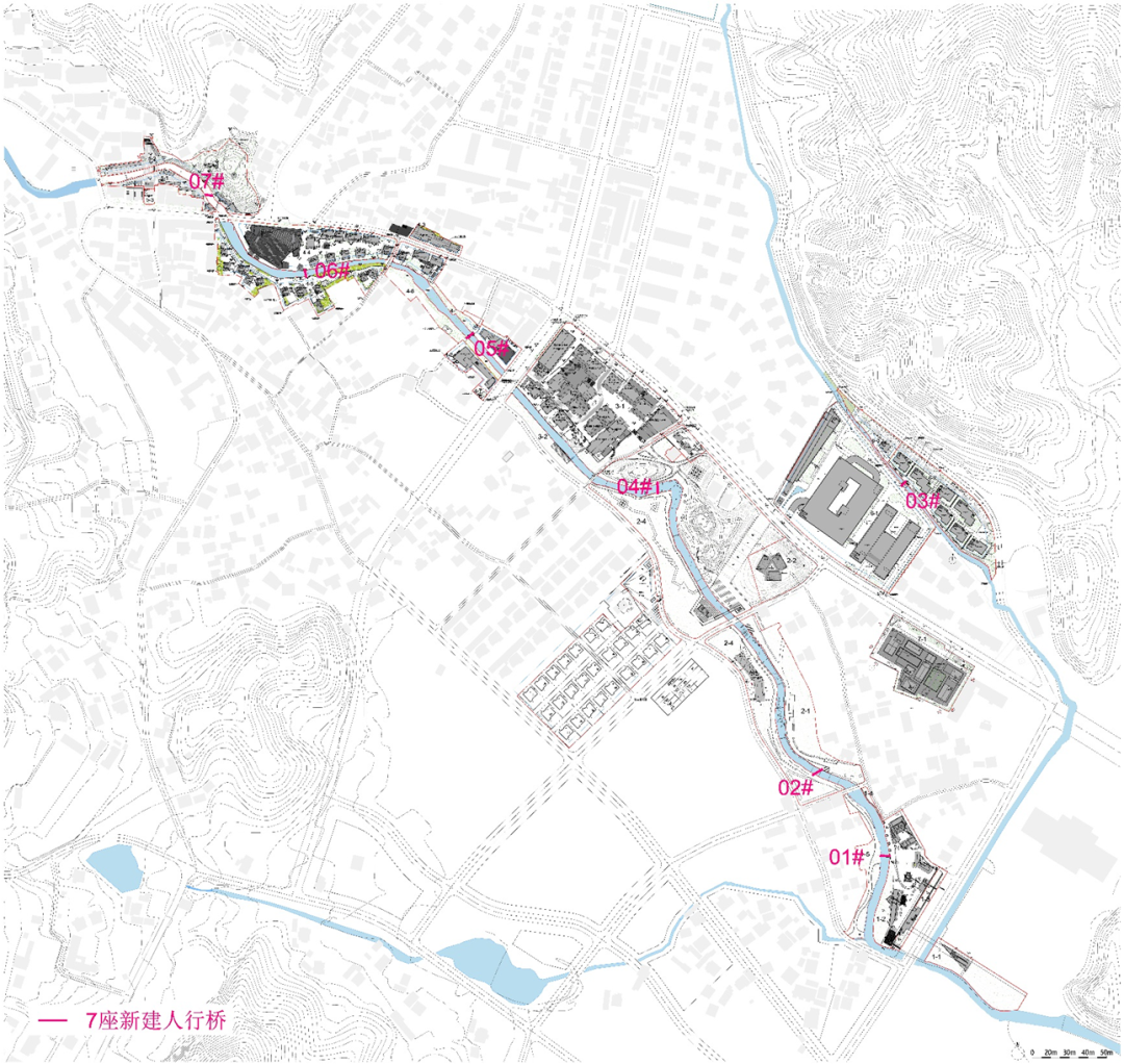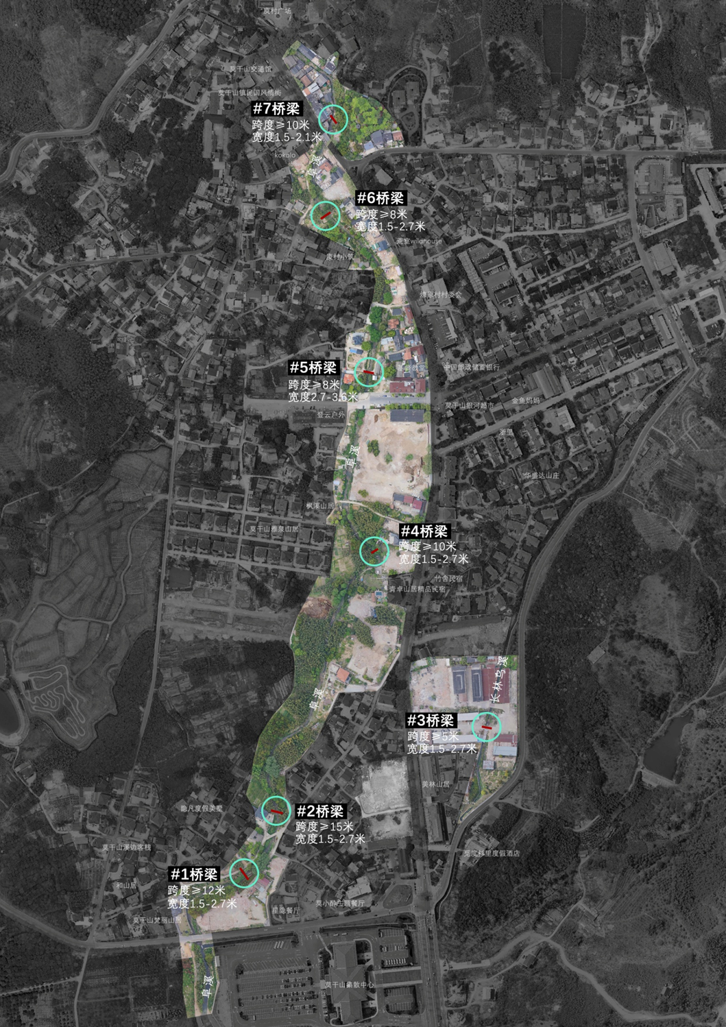 在阜溪 (莫干山镇段) 之上新建七座人行桥,促进阜溪滨水空间慢行交通网的完善,改善交通出行和公共空间品质,融入现代风格并适应未来变化,营造望山见水的景观节点,具有步行、游赏、连接功能,展示莫干山小镇的海派文化和国际化时尚生活方式。桥梁建筑造型体现地域风貌和时代特色,设计应符合国家有关的设计规范,注重建筑与结构功能相协调,同时考虑造价合理、可落地性及未来可持续性。