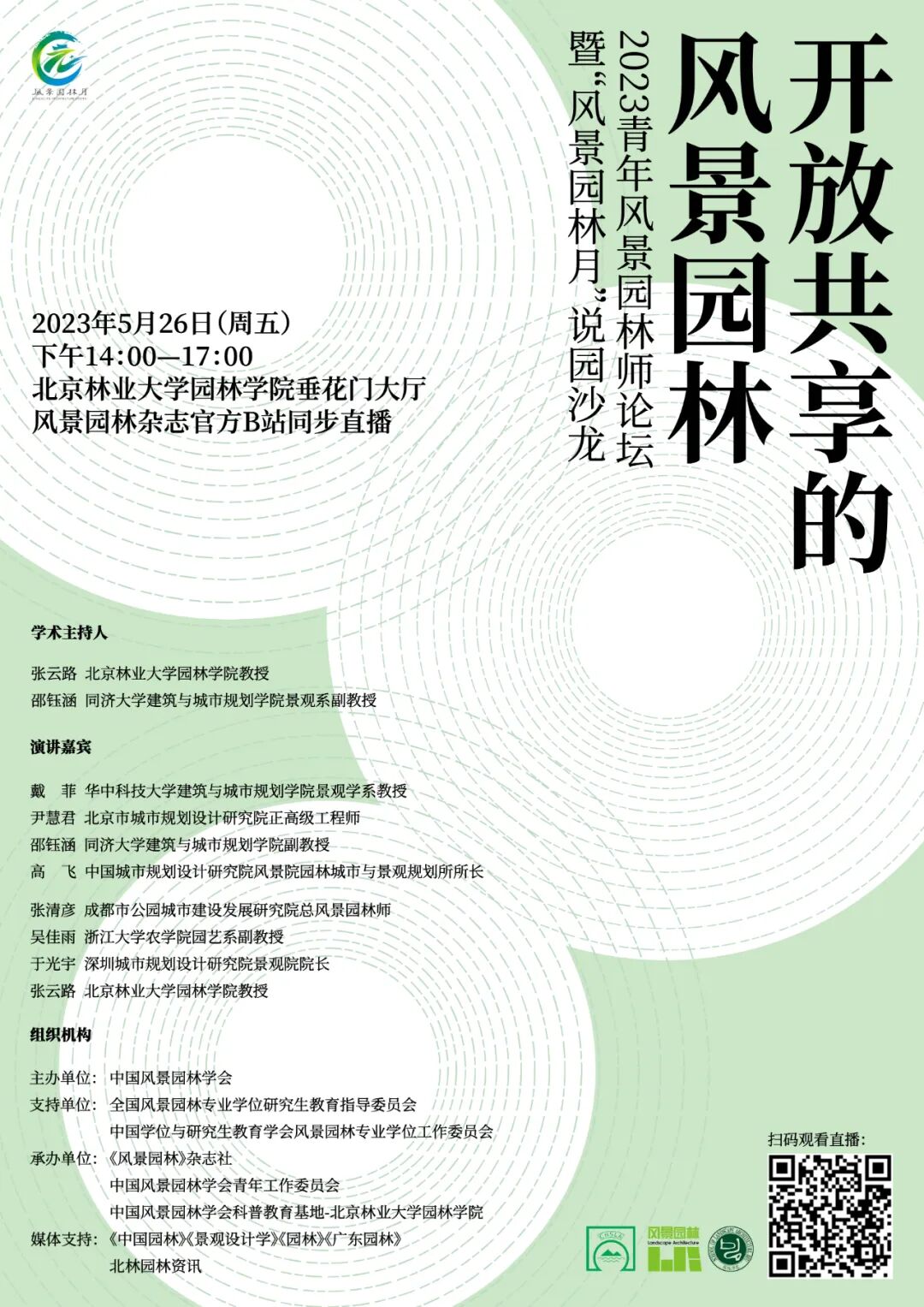 2023青年风景园林师论坛暨“风景园林月”说园沙龙将于2023年5月26日(星期五)下午14:00—17:00以线上+线下的方式为大家呈现。论坛主题为“开放共享的风景园林”。