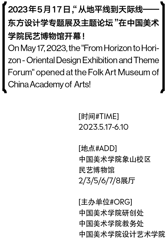 “东方设计学理论建构研究”课题的研究目标是建立具有本土问题意识且兼备全球视野的原创性“东方设计”学科体系,完成东方设计学理论体系的构建。“从地平线到天际线——东方设计学专题展”集中从四条叙事线,串联起东方设计课题的五大理论成果,勾勒出当代东方设计的学理轮廓、实践路径和价值愿景,开启新时代东方设计学研究建设标志性的新篇章。