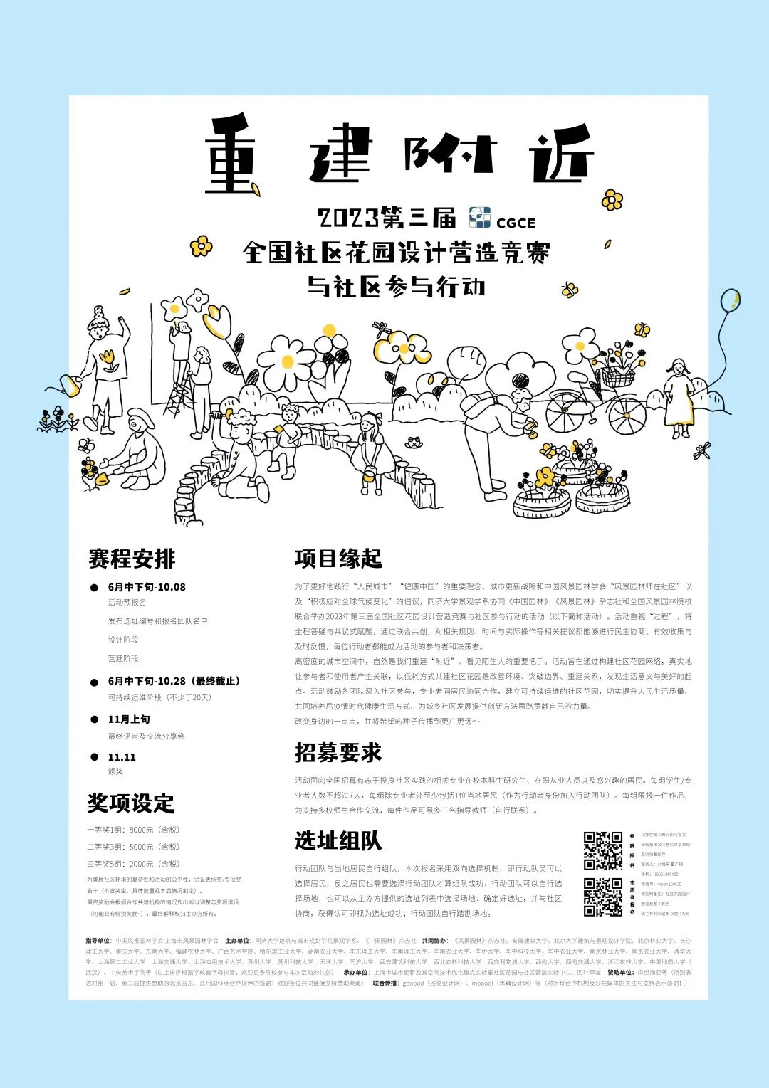 为了更好地践行“人民城市”“健康中国”的重要理念、城市更新战略和中国风景园林学会“风景园林师在社区”以及“积极应对全球气候变化”的倡议,同济大学景观学系协同《中国园林》《风景园林》杂志社和全国风景园林院校联合举办2023年第三届全国社区花园设计营造竞赛与社区参与行动的活动(以下简称活动)。活动重视“过程”,将全程答疑与共议式赋能,通过联合共创,对相关规则、时间与实际操作等相关提议都能够进行民主协商、有效收集与及时反馈,每位行动者都能成为活动的参与者和决策者。