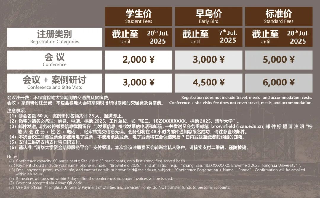 (2) 缴费时请务必备注:姓名、电话、棕地2025、工作单位,如“张三、182XXXXXXXX、棕地2025、清华大学”。