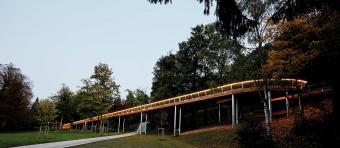 路径的布局需要保持高度谨慎,同时还要突显出景观的特征。为此,设计团队在路径的初始部分设置了一座人行桥,即使是行动不便的人群也能够在此享受到海岸的美景。这座壮观的人行桥长一百多米,从树林深入一直延伸到英式风格的公园。桥顶的观景台悬浮在城市上空,带来市区和瓦兹的绝佳风景。桥身以钢结构和橡木及落叶松木打造,能够抵御地震和强风。