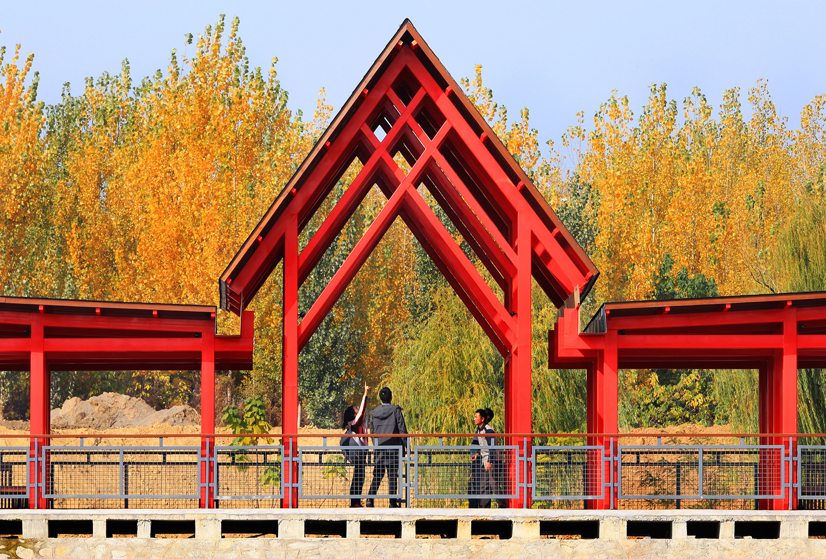 朝阳从远处的地平线升起,建起来的山门和舞台,主立面都朝向东边。这两个翼形的构筑物就像与日出呼应一样,徐徐展开,显出它们生动的姿态。山门东西两侧不同高度的水面,倒影着这显形的翅膀,时而静谧,时而随波荡漾。穿着绿色衣服的村里大妈,高兴地来到这里跳舞,红廊绿影,为这个久寂的山村添上诸多生气。空间开始发挥能量,在这个村里,在这里的场所。