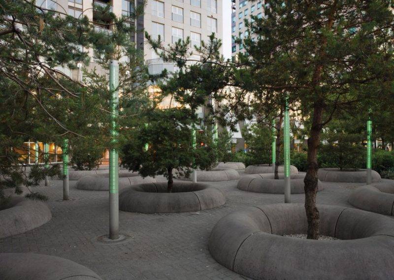 这个屡获殊荣的城市公园的设计反映了Yorkville村的历史和加拿大景观的多样性。 为了改变维多利亚时代收集箱的想法模式,这里曾经排排矗立着的房子,被改造布置成了一系列种植着具有加拿大环境特色的植物群落花园,并利用创新技术帮助开发了公园内的光雾柱、冰雨帘、“The Rock”等特色装置,来自多伦多以北的湖区的加拿大冰川盾的600吨碎片被逐个挖掘移除后,在公园重新进行组装,再将其放置在横跨地铁屋顶的结构梁上。 尽管早期有人持怀疑态度,但这块石头确已成为一个吸引人的地方,并成为市民们自豪感的源泉。