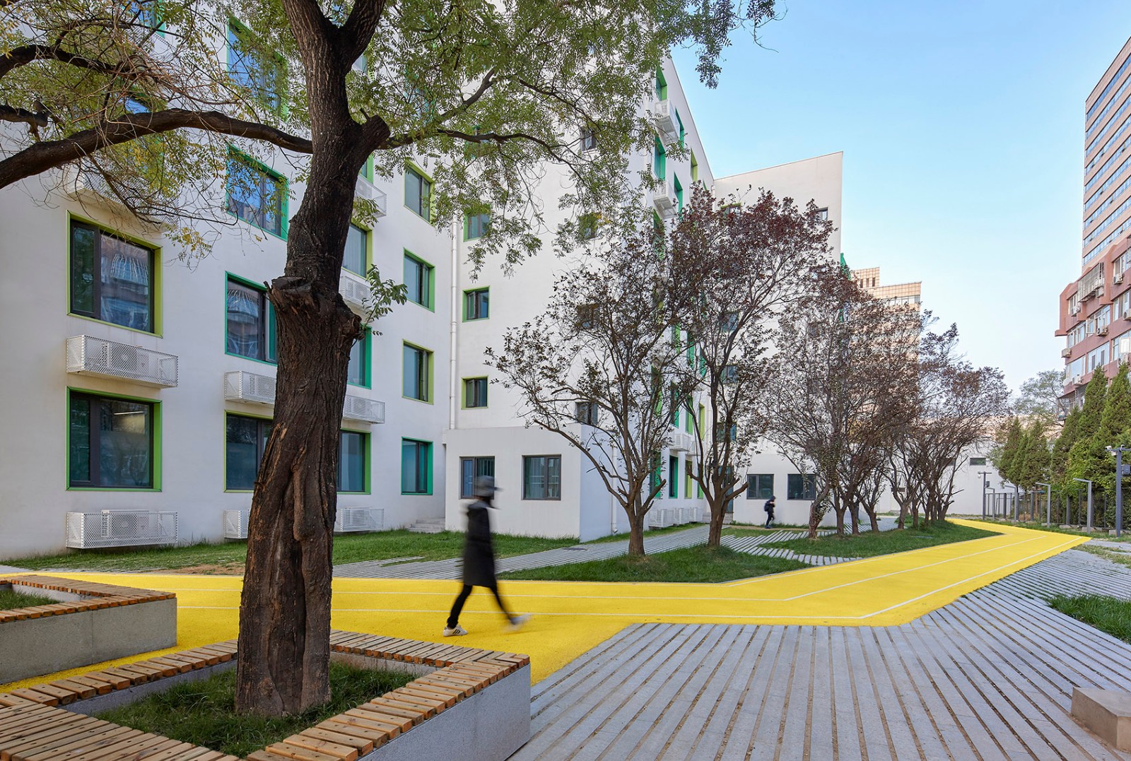 我们还在一条原先光线昏暗、功能模糊、利用低效的楼间消防通道,地面铺设了跑道,墙体间嵌入功能件,升级为一处集跑道、休息区、宣传栏于一体的复合功能空间。其中的百米跑道成为学校利用率最高的体育训练场地之一。