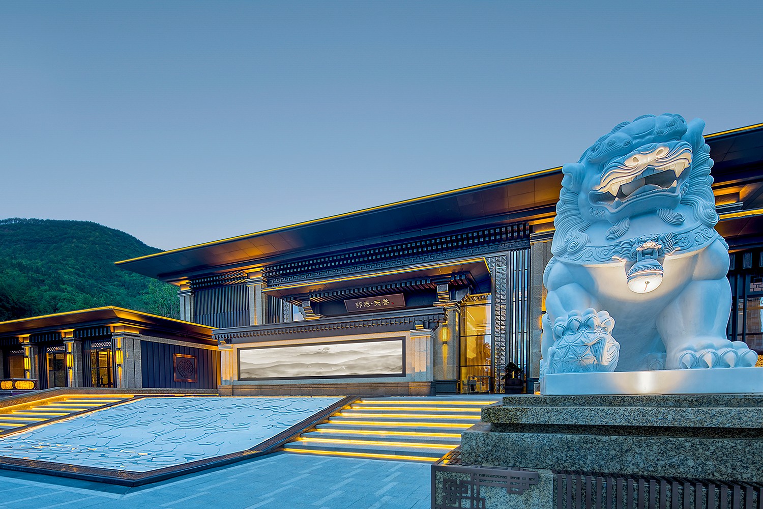 邦泰天誉(广元),三千水瀑,大殿小阁鳞次栉比,楼台亭榭相连,各种奇树异花点缀其间。在建筑构建和景观空间的营造上运用皇家园林的轴线关系来突出尊贵气质。宫殿式建筑雕栏玉砌,雍容华丽。