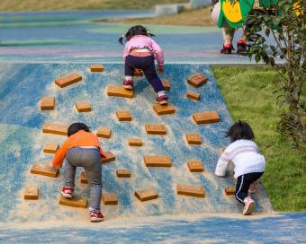 ▼儿童活动区,结合地形设计攀爬空间,场地铺设透水材料,引流雨水