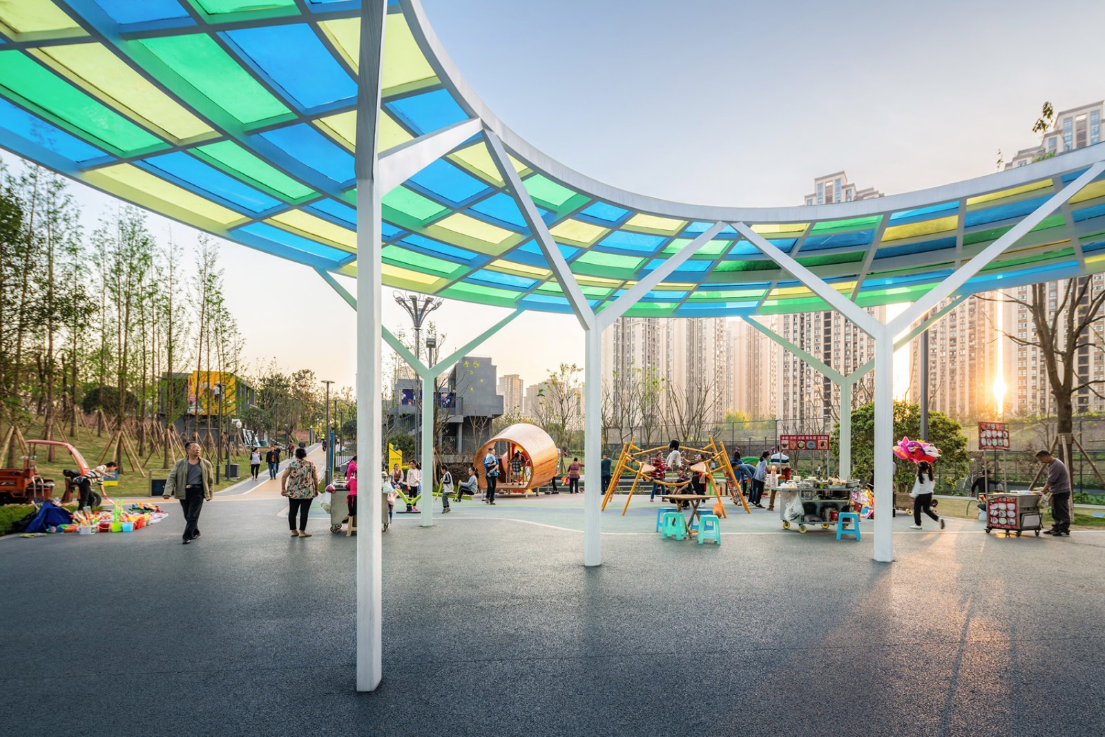 ▼公园中心廊架远景,色彩鲜明、造型质朴