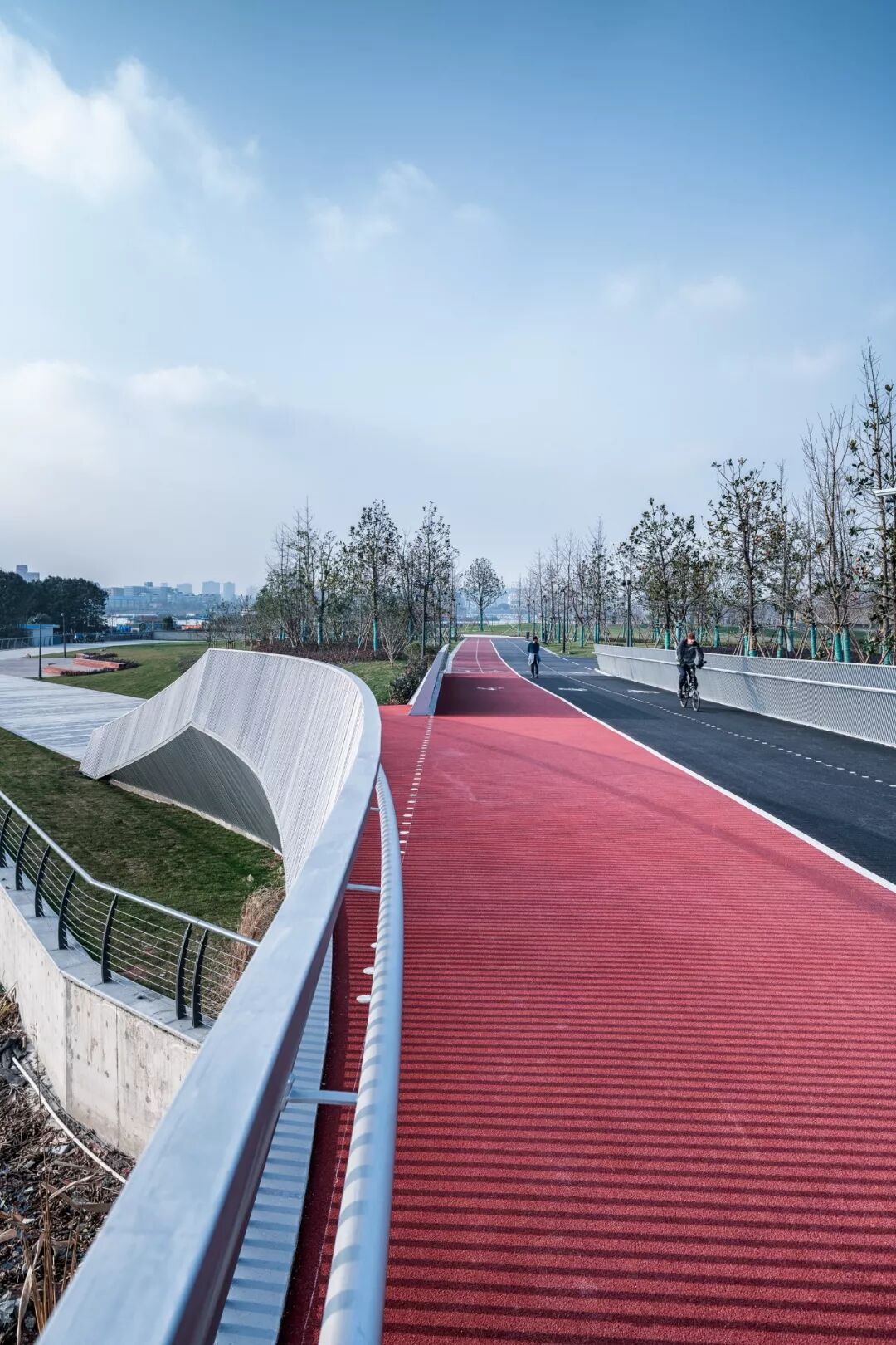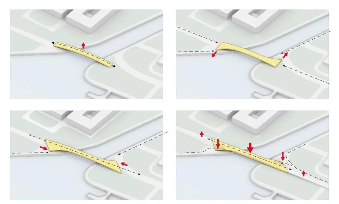 在两座云桥的设计中,试图探讨在常见的线形桥身之外是否还有别的可能性,并且形成连贯的设计语言,以此强化双桥的印象。因此在两座桥的设计中,都在尝试演绎一些几何形态上的变化,也充分考虑到与桥两端城市、景观环境的衔接。