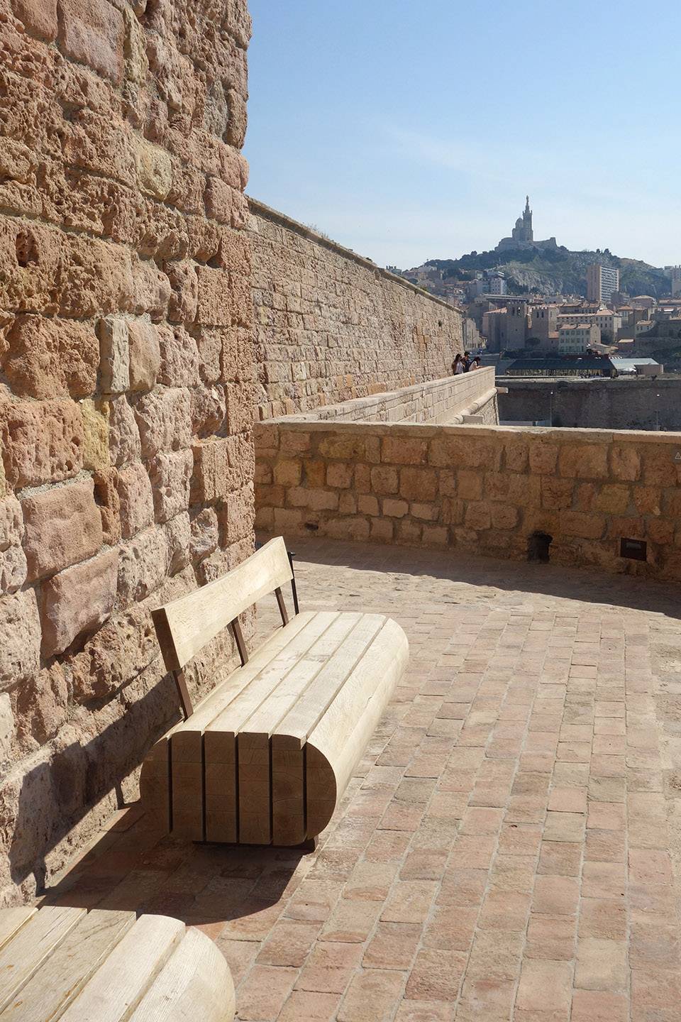 退台式休息空间位于d’Armes广场的东侧,坐落在Georges Henri Rivière大楼的对面,与Georges Henri Rivière大楼同长,并在与Mucem人行天桥交汇处向北转折。木制座椅可以提高户外生活的舒适度。这处休息空间自带高差,通过一系列大小不一的石阶和坡度为4%的之字形石质坡道来实现彼此之间的联系。坡道系统从d’Armes广场的南侧开始,一部分延伸到东北侧的人行天桥处,另一部分则通向东侧的山地花园。