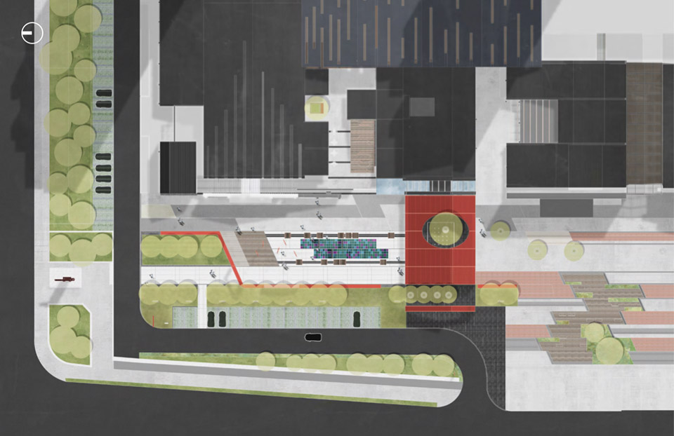 我们将旧厂的外轮廓平面转化成立面的线,加以设计运用到门庭上。连廊构架的运用将门庭与后场的老柴厂旧墙相融合;两个空间串联在一起,链接古今,让人仿佛走进了时间的隧道;考虑到廊架原始场地上的6棵原生大树(场地中央1棵,前排廊架有5棵),我们将廊架顶部开洞,前排切断,并将其镂空,为大树创造良好的生长环境。红色的连廊构架让整个入口在茂密杨树的衬托下异常显眼(虽然最后并未漆成红色),相互映衬,相得益彰。