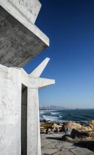 石环亭位于北侧山体,清水混凝土之分量与质感均与地貌协调。由于山体不大且北侧海神庙很小,石环亭直径4.6米,净高2.4米,体量严格控制。在形态设计上,石环亭一面加大构件尺寸,朴素浑厚;一面通过檐部出挑、立柱收分产生伸展之动势。置身亭下,东临碣石,以观沧海;远而望之,如花瓣、如海螺、如皇冠,体量虽小,张力饱满。