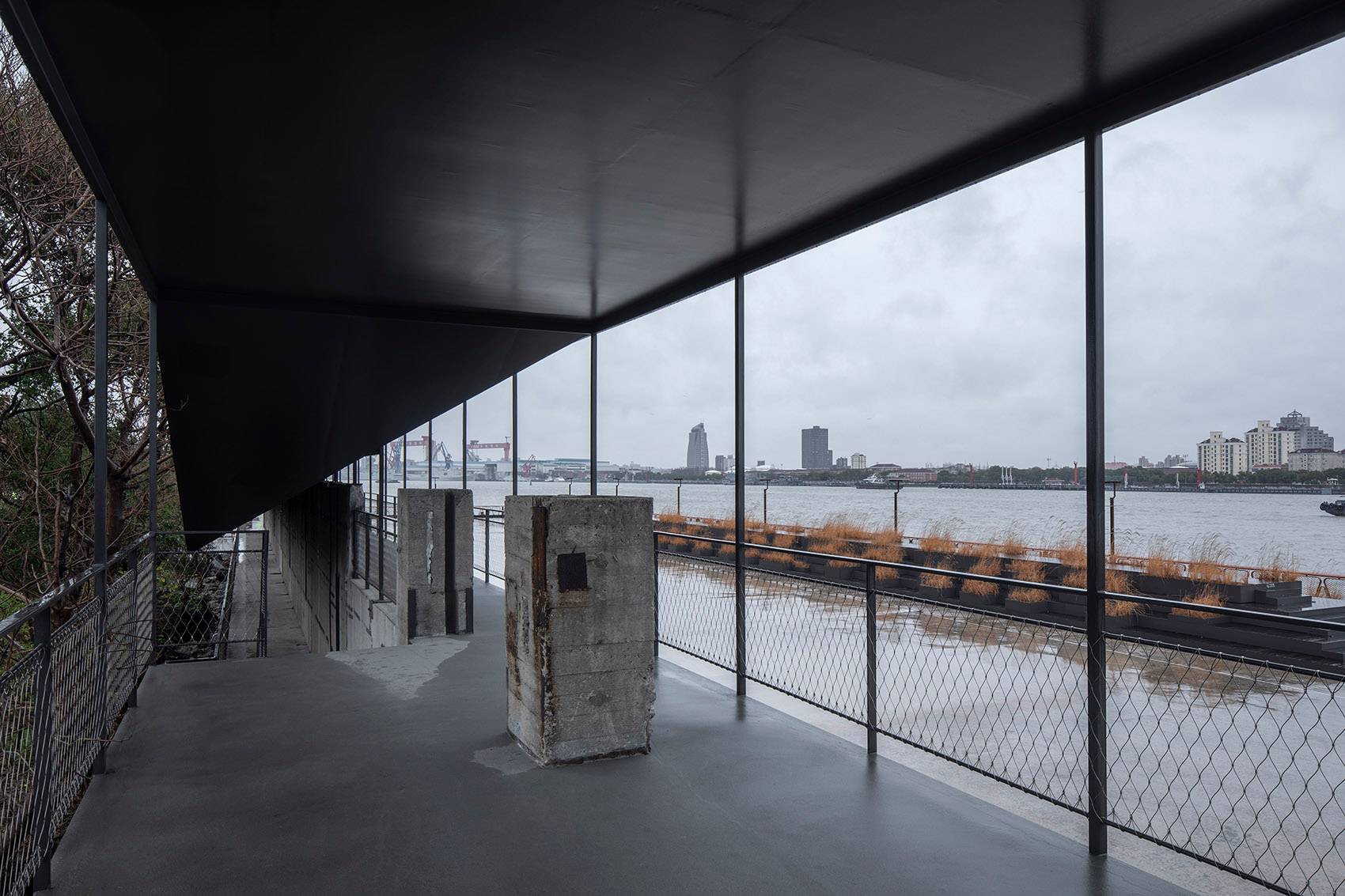 新的建造将那堵长长的坚实的混凝土墙作为继续建造的基础,一个具有地基意义的基础,或者说是一个基座,把一个跨越防汛墙和码头缝隙、穿越那荒野的树的坡道连桥、一个腾空的长廊、一处可以闲坐的亭,都附着在这堵坚实的墙上。一个单坡的屋顶,有效地定义了墙内墙外的空间,墙内对着码头和岸边缝隙里带有荒废感的花园,是落地的檐廊,墙外则是挑空的看江的高廊,一边是压低的,一边是扬起的,暗示了观看尺度和远近的不同。