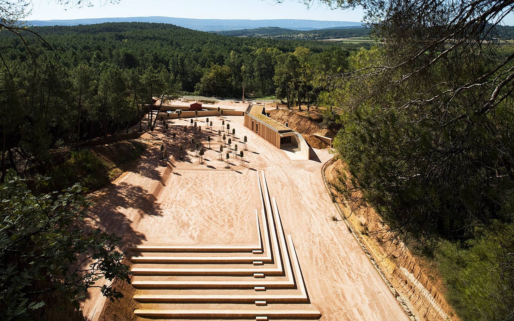 在自然景观中选择恰当的介入方式是促使该项目成功落实的一大原因,其重点在于平衡自然场地与采矿行为之间的关系。该矿场拥有多腔的特征:在19世纪时,场地上的悬崖被掏空以进行全国性的开采。施工过程必须对自然地形及其生态系统予以充分的尊重。景观方面的介入也尽可能地利用了赭石矿场的既有资源。场地的另一个显著特征是其贫瘠的沙地,十分不利于植物的生长。为了使森林系统得以再生,为一些特定的地点提供荫蔽,项目团队需要移动一些树木并进行新的种植。