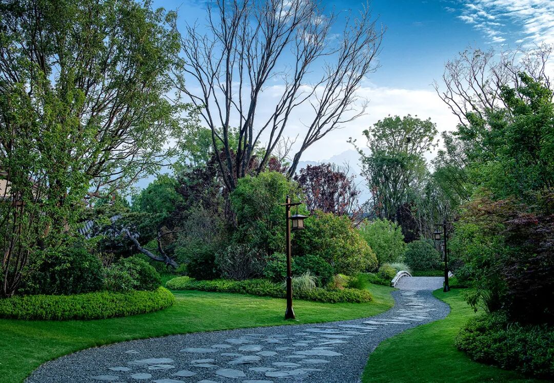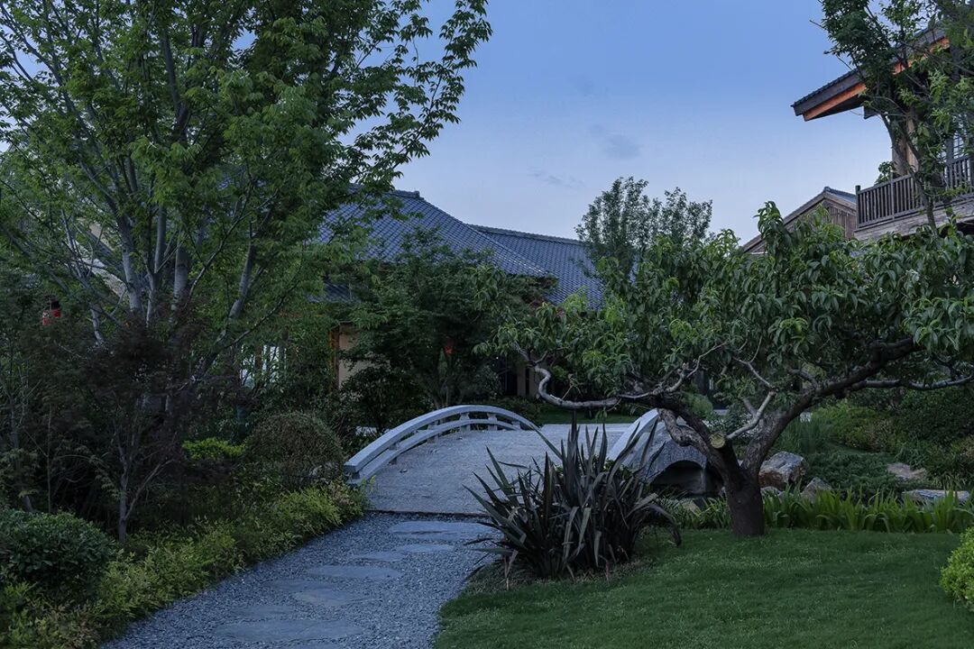 设计师打造唐风古朴庭院,夏日清晨的阳光从树丛中隐隐约约的的穿透过来,穿行于古朴幽静的园路之中,随处都能感受到具有山水意境、层次丰富的景致,体会到隽永宛致的审美意境。