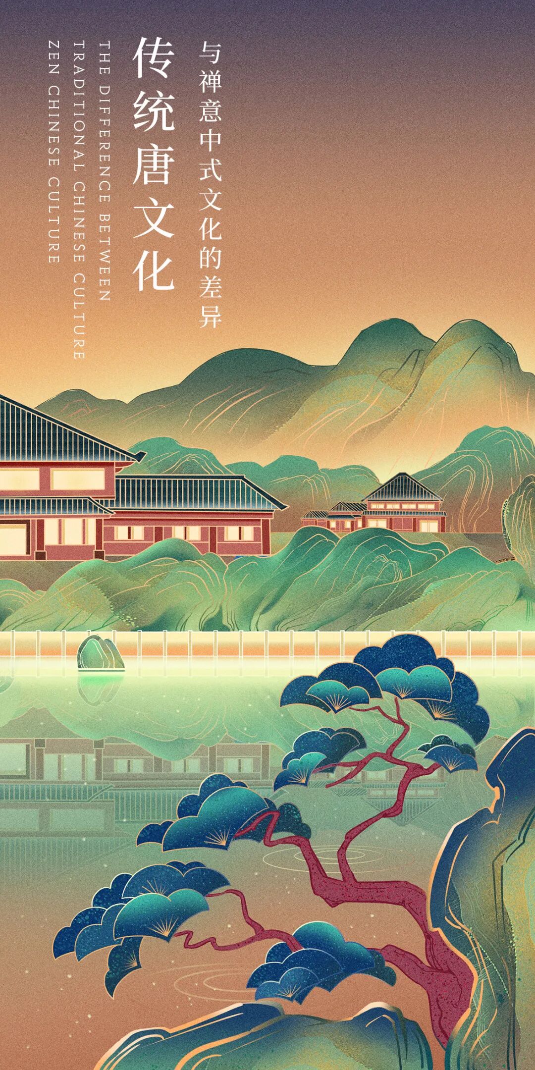 中式禅意的起源,应当追溯到白马寺,加之日本对其反向文化影响,使它更倾向小而精美的营造方式。反之,传统唐文化景观以儒道理论美学为基底,用其学而不用其意,营造生态自然的气氛,在景观语境中,我们讲究阔而美的营造方式。此外,唐朝受到诗词画作的影响,中国园林由原来的自然山水园发展成为写意山水园,使得园林更具有诗画情趣。