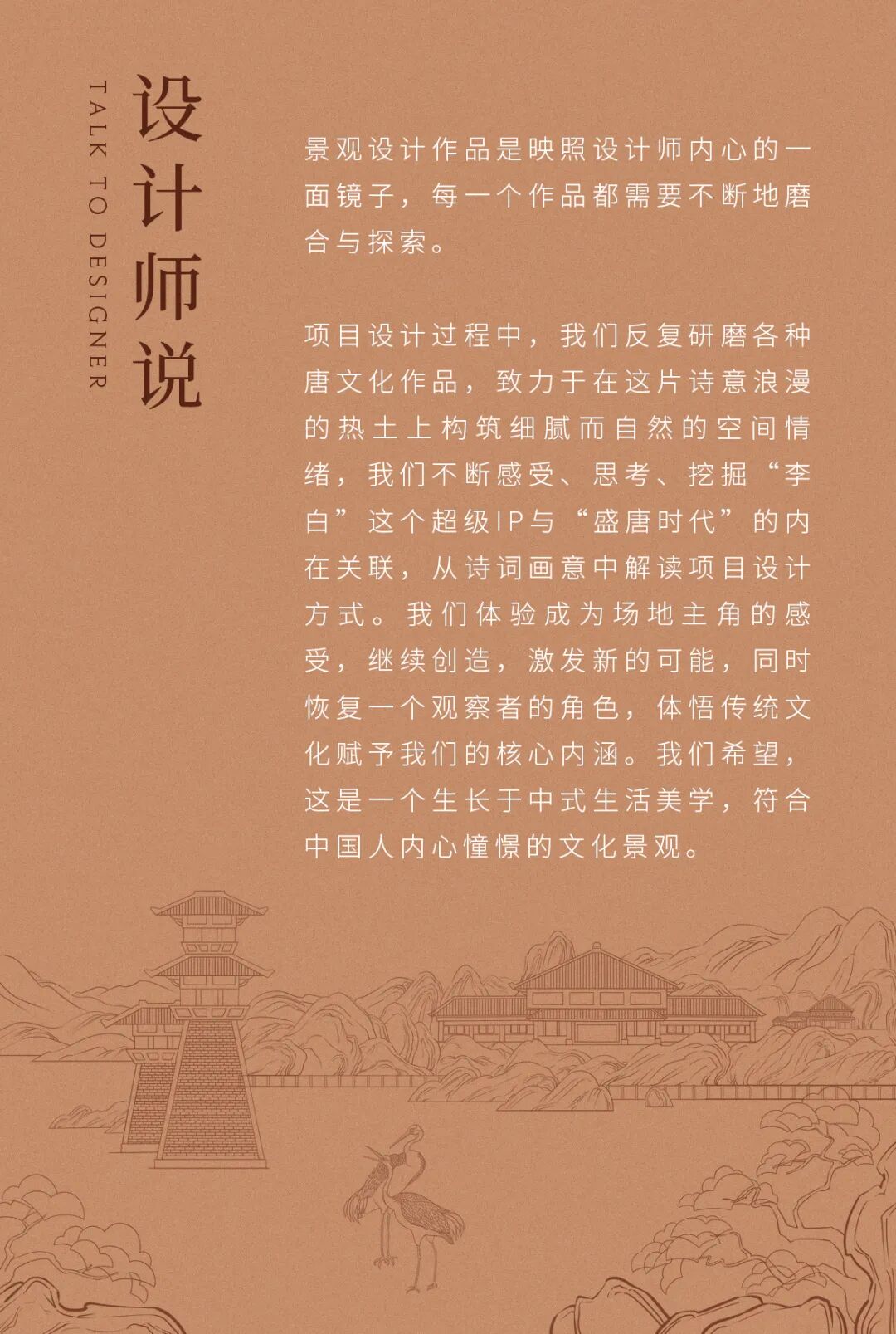 繁荣赋予了唐朝不朽的影响力,在回望其发展的视角中,我们发现山水诗文被文人们融合到了造园思想之中,野趣、朴素、清纯成为其代表性符号,我们延续这种设计语言,将其贯穿设计始终。