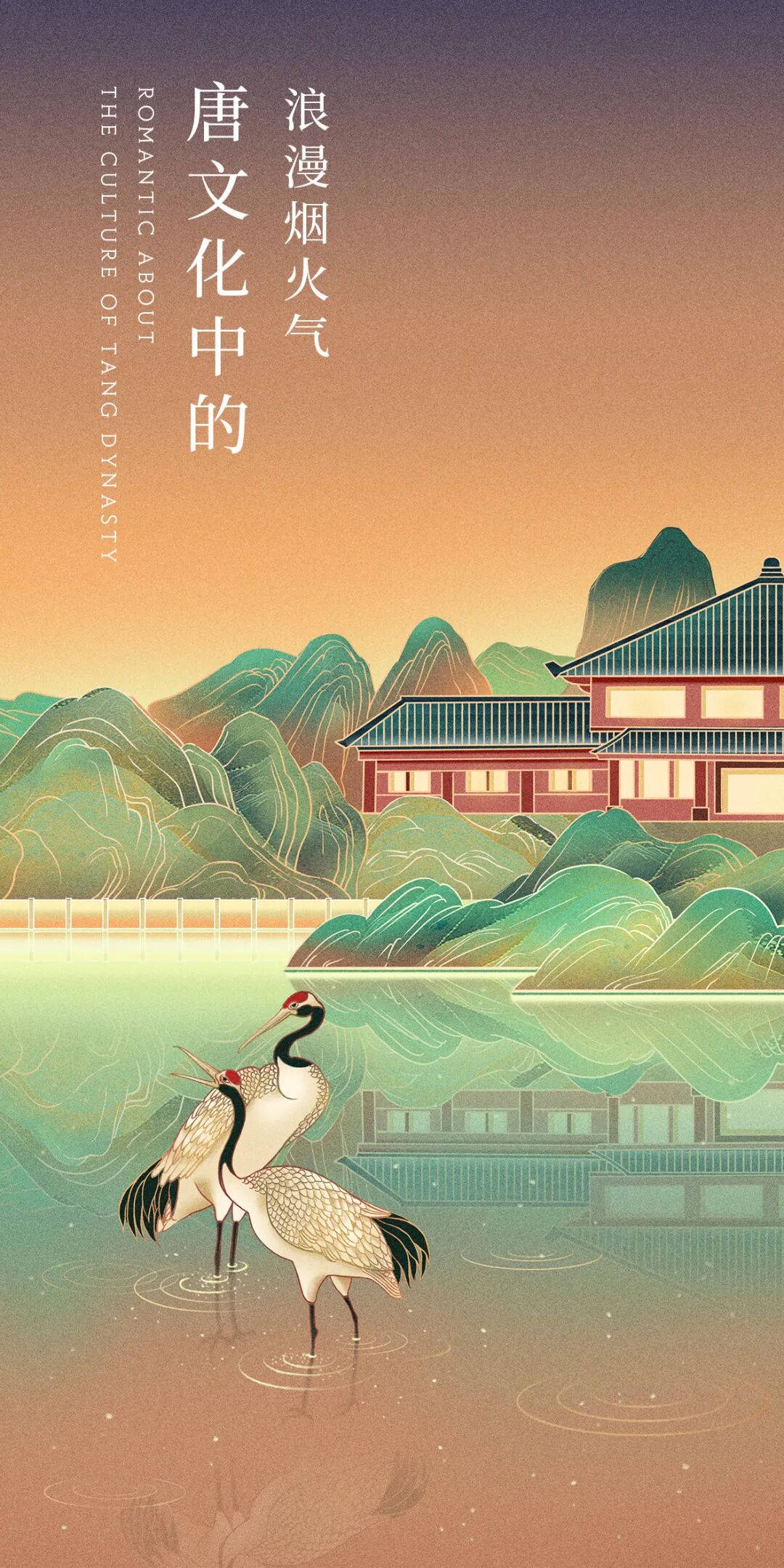 卢照邻的《长安古意》第一句话就写出了长安流光溢彩的场景,“长安大道连狭斜,青牛白马七香车”。这种绚烂华丽的景象激发着设计师,我们用设计语言演绎唐朝自然野趣。