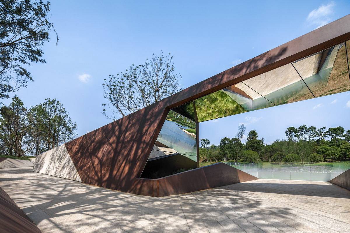 滨水建筑对一线湖景资源的诉求以及狭窄的陆域进深,导致很难利用植物层次来造景,因此设计团队决定延续建筑漂浮屋顶的设计理念,再置入一个与建筑屋顶相呼应的景观构筑物——折廊。