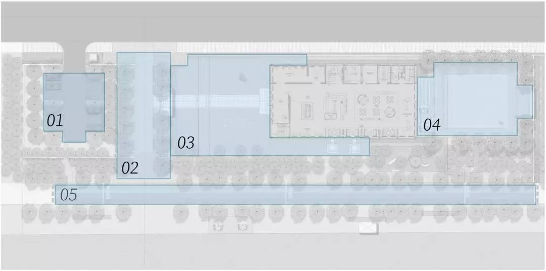 01 停车落客空间 02入口观景迎宾道 03 前场水景区 04 后场洽谈空间 05沿河林荫步道