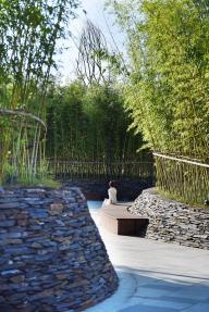 ▲侧壁以深浅不一的片岩砌筑,赋予粗犷的自然肌理。围合的景观空间营造出幽深感,场景纯粹干净 ©超越视觉 The side walls are built with schist of different depths, highlighting a rough natural texture. The enclosed landscape space creates a sense of tranquility, pure and clean