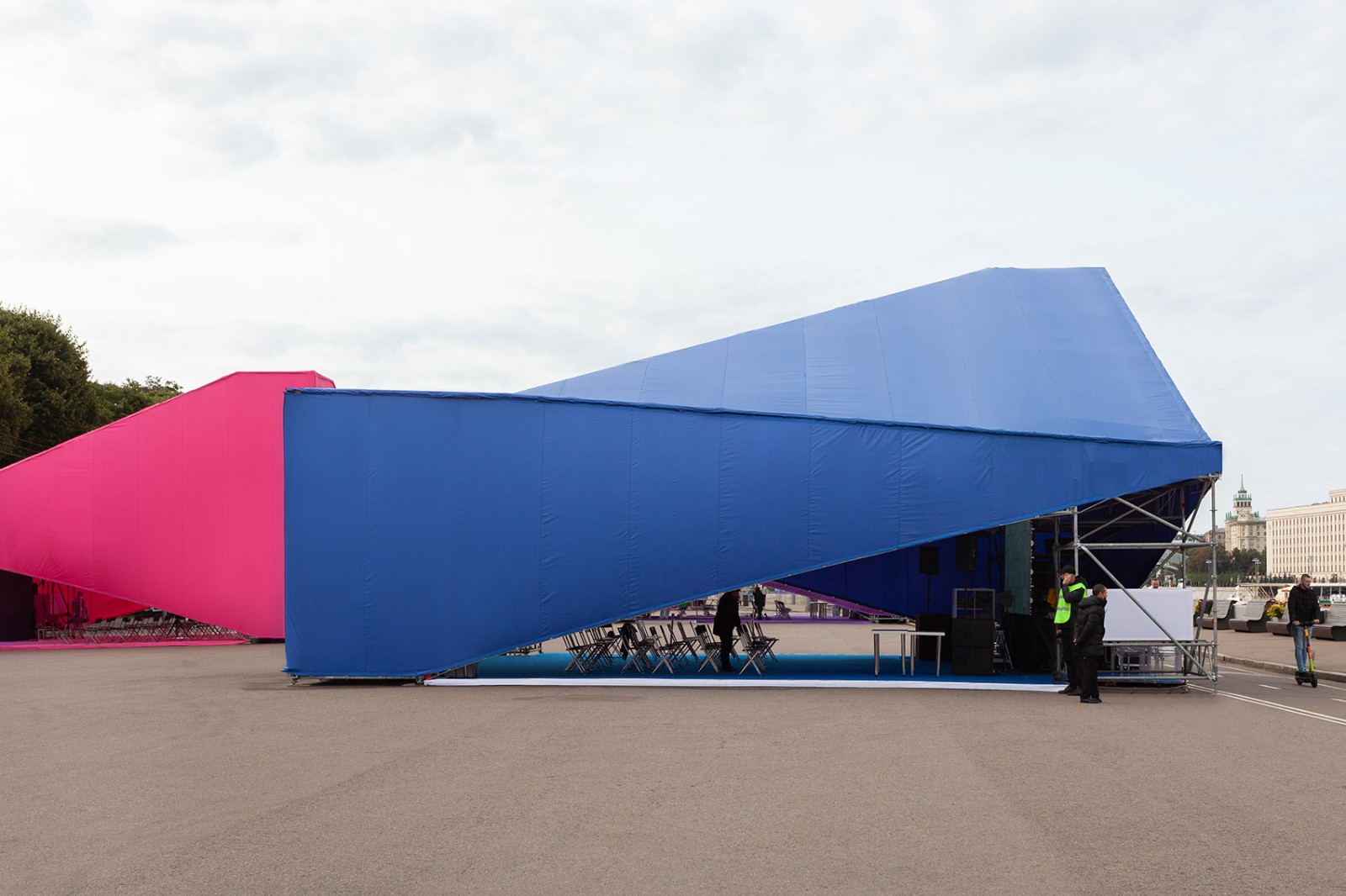 14 volumes – thematic lecture halls were created for the festival, as well as pavilions that include meeting areas, press booths, and an information center. Three days of events, lectures, educational programs, exhibitions and master classes were held, which attracted a wide audience. The goal was to create a festival with memorable objects in a difficult epidemiological situation. The polyhedral pavilions have a high ceiling plane and a colorful interior for lectures, and their composition transforms the waterfront. The sloping facades allowed the events to be partially open to the public, and provided several means of egress to comply with the Russian building and sanitary code. Each lecture hall has a total capacity of 60 visitors, taking into account the need for social distance.