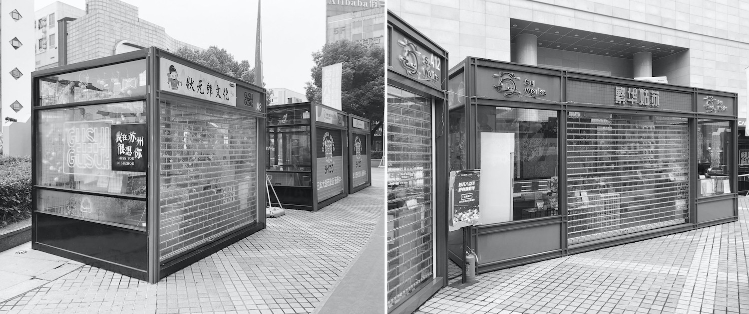 XPORT is located at Guanqian Street in Gusu District, Suzhou, the centre of the old quarter. Compared with other parks in Suzhou, although this pocket park’s volume and content are not outstanding, this small plaza-sized place is surrounded by opera houses, bookstores, theatres, People’s mall and other public buildings, which lead this little place be well known since the 20s’ last century. This year, the pocket park was transferred into a pop-up bazaar that stimulated the high-street in old town by inserting programmed containers. Recently, taking advantage of Suzhou International Design Week, this pocket park is once again empowered by design, with a new label and presence.