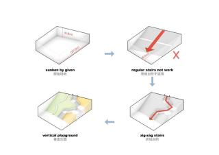 根据日照分析,校园西侧的两个下沉庭院是阳光照射最多的区域,它们也是最容易,最频繁被学生使用的景观空间。北下沉空间和较小的南下沉空间分别连接自助餐厅和室内体育场。它们有不同的深度(5.5米和6.8米)和功能定位,一个成为户外课堂和课间活动广场,另一个成了趣味性极强的垂直游乐场。