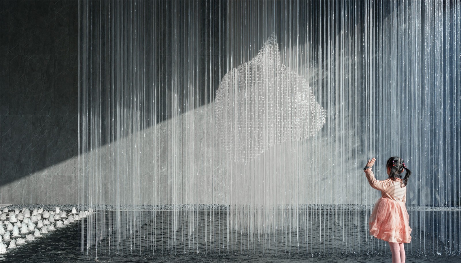 入口的新雨广场,还原了粤语地区最脍炙人口的岭南童谣《落雨大》场景,勾勒出民风务实的城市烟火味,让粤语文化记忆浮现眼前。垂直而下的雨帘中,加入光纤维与全息投影,猫的形象被人类艺术化为项目IP形象“天妹”,灵动的猫头造型在水帘中闪烁着,描绘出奇幻的视觉艺术。