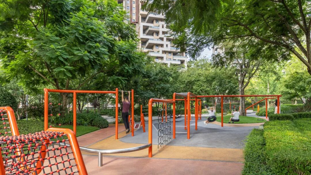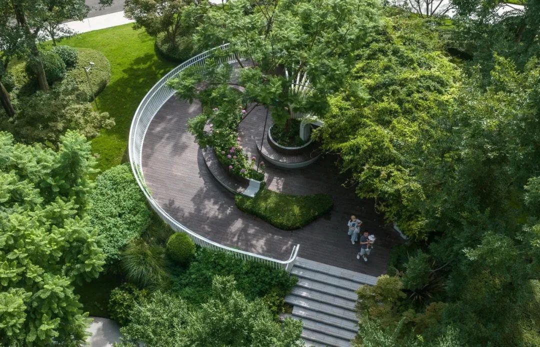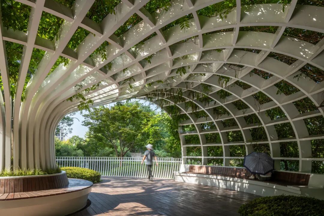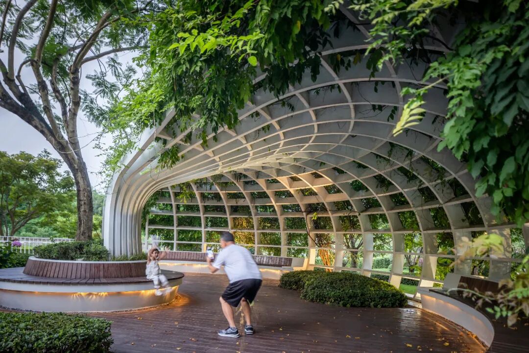 林荫广场与休闲树屋是全龄运动区的另一类重要空间。林荫广场香樟大树间隔种植,提供舒适的遮荫环境。在休闲树屋的设计中,白色半圆形廊架的简洁线条与自然光线相得益彰,营造出明亮而宁静的氛围。特选蓝花楹与廊架相向生长,共同构成完整而和谐的生命体系,掩映于郁郁葱葱的树林中,打造与自然相融、与心灵对话的空中花园。