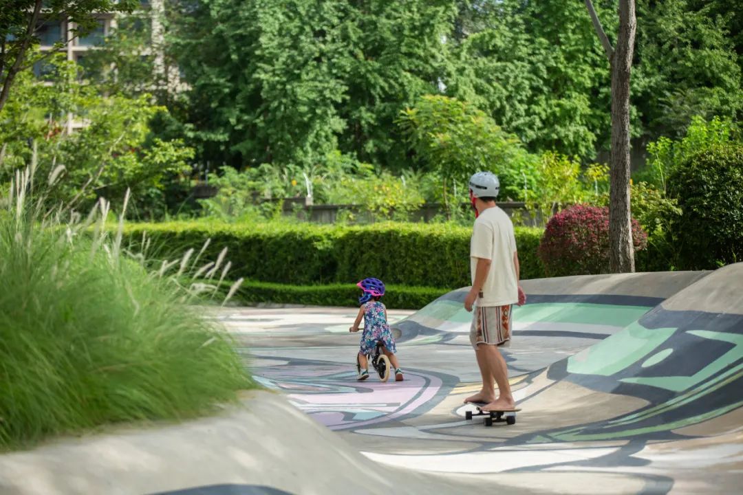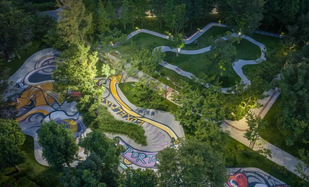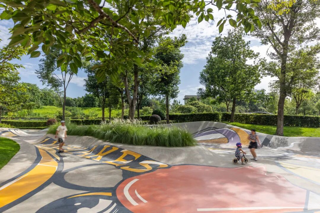 滑板场地与趣味泵道是运动公园的一大亮点,主要服务于儿童与青少年。不仅为使用者提供了一个展示街头文化魅力的平台,更成为他们释放活力与创造力的理想空间。从整体的外部形态、种植池的位置到内部的圆角、坡度、铺装分缝等都经过了设计团队反复的研讨与重构,呈现出一个兼具专业性与实用性的场地。地面涂鸦的设计更是为这片场地注入了鲜活的灵魂。