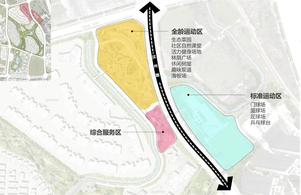运动公园被汉州路划分为东西两部分,西侧靠近社区便于居民使用,东侧则相对远离社区,环境影响较小。设计团队将场地划分为全龄运动区与标准运动区,打造一个覆盖全年龄段、全运动需求、兼具活力与诗意的城市公共空间,成为麓湖片区健康生活的核心载体。