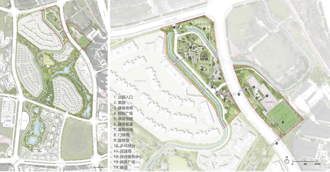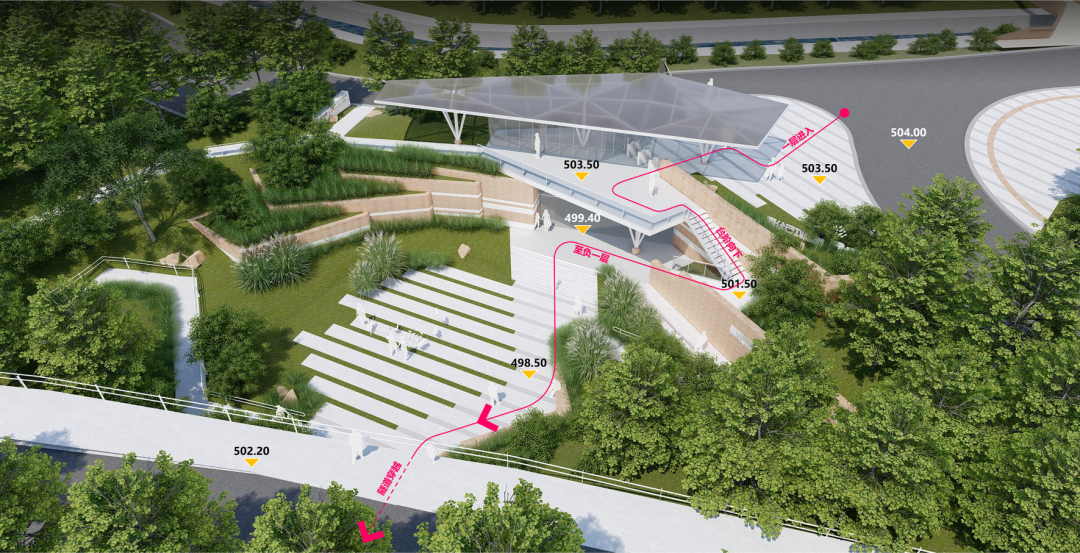 设计团队精心打造的服务建筑,不仅兼顾了休息、更衣等综合服务功能,还巧妙地作为上下层转换空间的纽带。地下隧道贯通全龄运动区和标准运动区。功能区被有机地连接起来,形成了一个高效、便捷的交通网络。设计最大限度地保留了场地的自然风貌,让居民享受顺畅的步行体验,让自然与人文和谐共生。