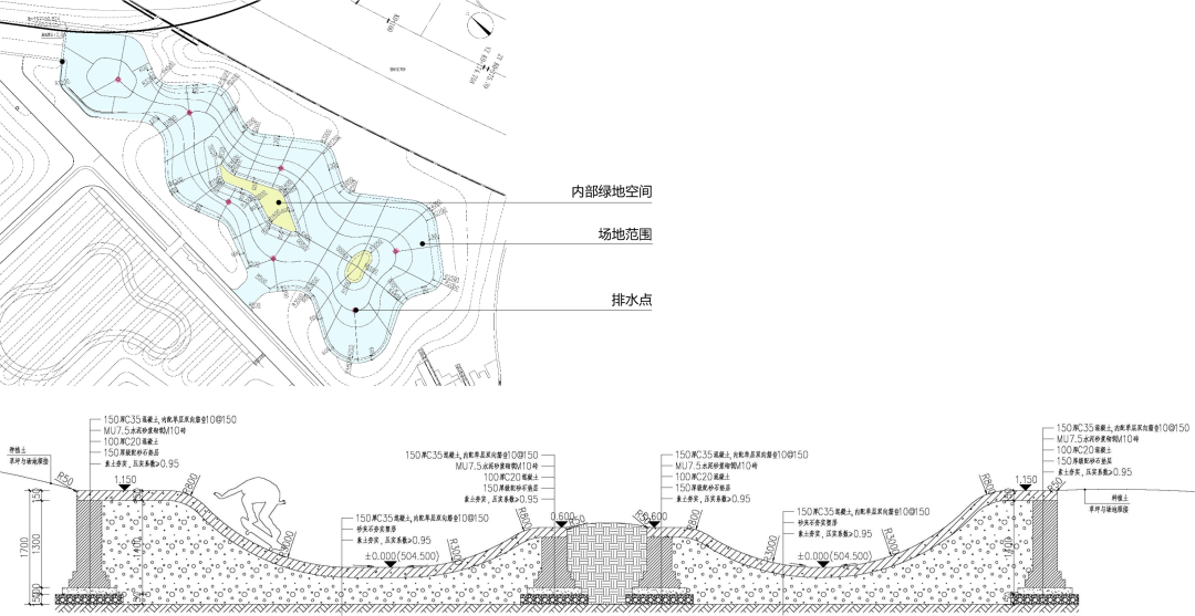在场地的构建上,基层选用当地砂石垫层,降低成本,凭借砂石的天然特性,为整个场地奠定了坚实的基础;表层选用150厚高标号C35混凝土,内配钢筋,使得场地能够承受更大的压力和冲击力;再结合不规则分缝的设计,有效释放因温度变化、地面沉降等因素产生的应力,保证场地的稳固性和耐用性,避免开裂。同时,多点分布的排水槽犹如一张精密的排水网络,能够迅速将雨水引导排出。即使在雨季,也能为使用者提供一个干燥、安全的运动环境。