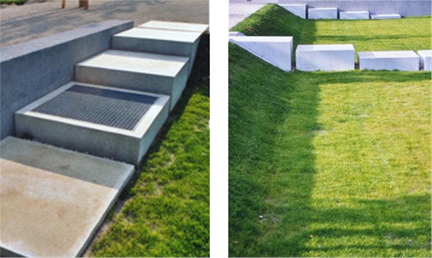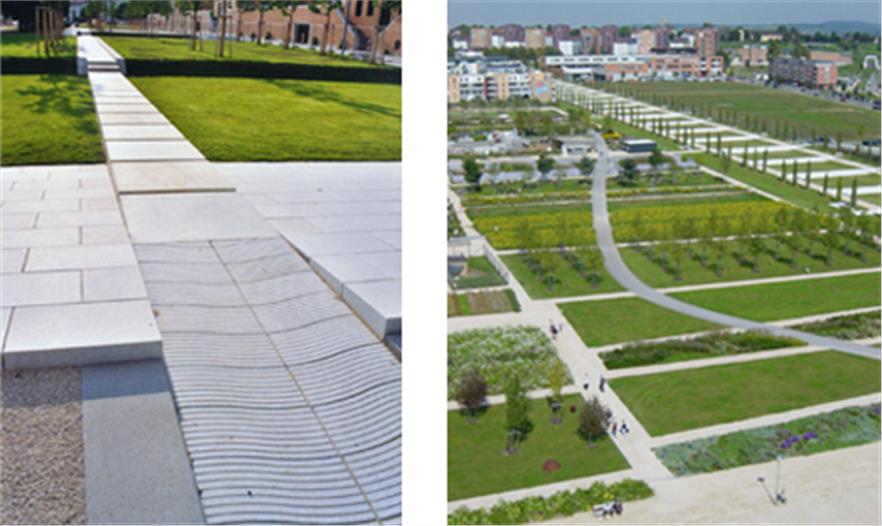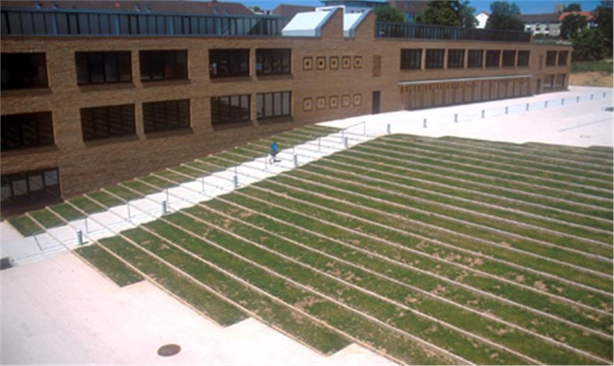 在37000多平方米的封闭空间范围内进行表面雨水治理的策略催生了在城区内从根本上集成的双功能娱乐空间。分散式雨水处理切实体现了整体发展中的绿化特点。