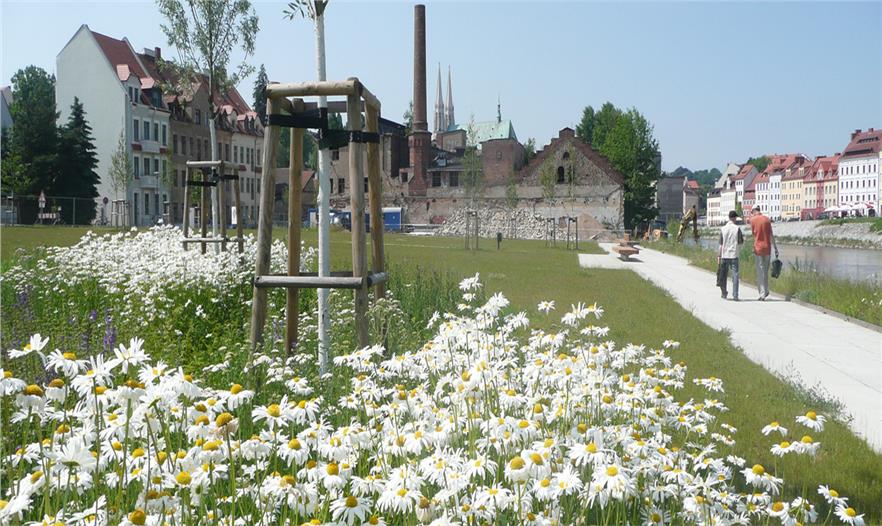 在格尔利茨市尼萨河的滨河区,Rehwaldt景观设计事务所在之前的工业用地上建造了一个公共公园。这个开阔的空间能观赏到该河流的景象,甚至能观赏到对岸波兰兹戈热莱茨的景色。由于去除了河堤,人们现在能安全地接触该河流。该设计受之前纺织业的启发建造,在其全盛时期多个工厂能生产出各种各样的产品。大型浮雕地板将这个传统得以呈现,以抽象的方式引用了工业编织的古典图案。尼萨河沿线漫步道状的道路构成一个连续的路线,从城市中心到南方,甚至包括未来邻近的厂房。