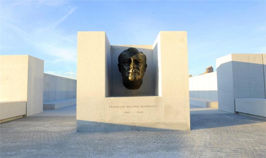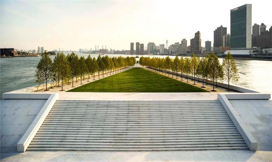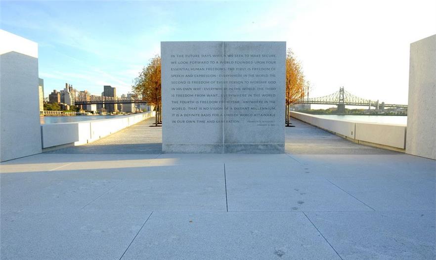 纽约的“四大自由公园”是个长时间拖延的项目,由著名建筑师路易•康(Louis Kahn)在他临去世之前的1974年设计的。这个项目是对罗斯福岛的改造。罗斯福岛位于东河之中。这个项目为前美国总统富兰克林•罗斯福创造了一个永久性的纪念碑。康的设计方案,将这个岛的一端改造成一个三角形,岛上种植了两排树木。这些布置围绕着罗斯福的一个青铜头像雕塑。这个雕塑是在罗斯福在世时,由艺术家德维森(Jo Davidson)创作的。上个世纪七十年代,由于纽约市濒临破产,这个建设项目拖延下来。2012年10月重建后向公众开放。