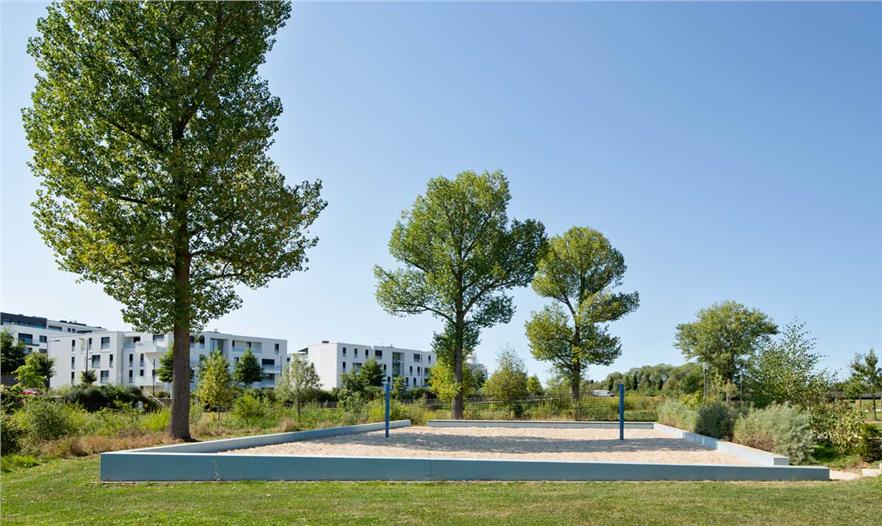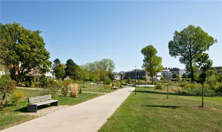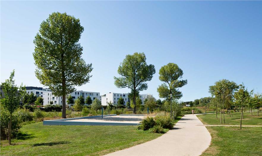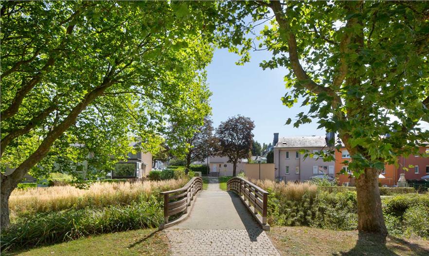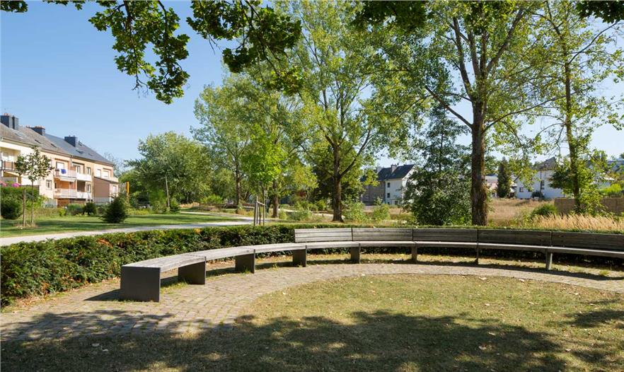 开放空间概念基于以下三个设计元素:“自然带”“城市带”“特殊地”。自然带建在上述的Zéisséngerbaach沿线。一些区域是自然发展的,其他区域生态获得了改善。该公园融入了现存的地形情况,设计成一块湿地,草地繁茂且广阔。