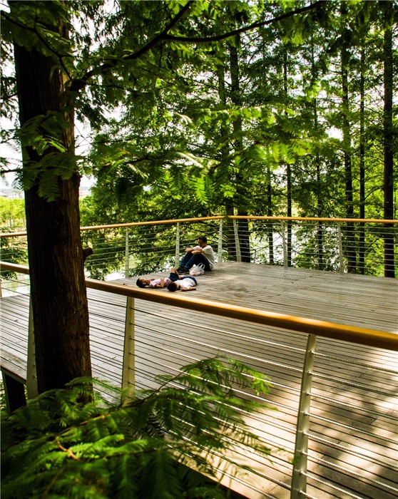 浦阳江两岸枫杨林茂密,设计采用最小投入的低干预景观策略最大限度地保留了这些乡土植被,结合廊道周边用地情况以及未来使用人流的分析采用针灸式的景观介入手法,充分结合场地良好的自然风貌将人工景观巧妙地融入自然当中。设计长度约25公里的自行车道系统大部分利用了原有堤顶道路,以减少对堤上植被造成破坏;所有步行栈道都由设计师在现场定位完成,力求保留滩地上的每一棵枫杨,并与之呼应形成一种灵动的景观游憩体验。