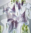 “声波”雕塑位于襄阳中华紫薇园入口处。襄阳是中国南部一座古老的城市。周边绵延的山谷勾勒出雕塑的轮廓,并从水平层面建立起雕塑和周边环境的联系。500块鳍片竖向分割了周边环境,在各色鳍片的共同作用下,将雕塑打造成一个区域地标。紫薇花四种深浅不一的紫色,构成了项目的色彩方案。游客进入鳍片区后,会有片刻的迷失方向。但同时又能透过鳍片间的开口空间一探究竟。这些开口后面的空间变幻不定,有狭长的步道,视野开阔的空地,给人一种林中漫步的错觉。从而通过游客和广场舞人群为雕塑在白天和夜间注入更多的活力。广场是城市和景观的过渡空间。从远处看,雕塑是一条优美的城市天际线。而进入雕塑后,绚丽的色彩和灯光则以一种极为感性的方式,邀请游客探索紫薇园内的自然风光。