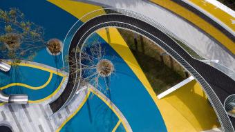 椭圆和自由曲线形成功能性的综合场地。蓝色与黄色的EPDM塑胶地垫拼贴组合,形成几何化场地,容纳安放趣味和想象。