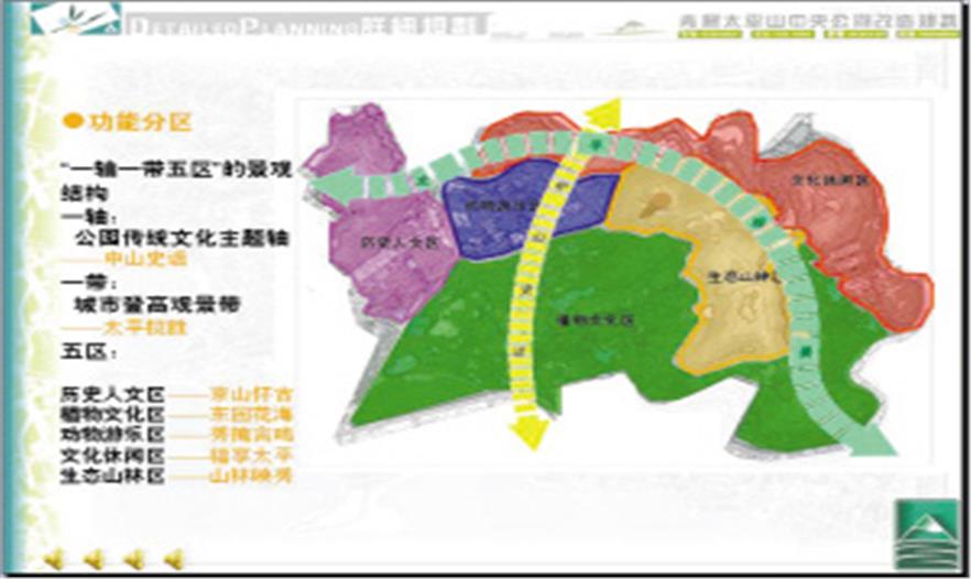 记者昨天看到太平山中央公园的规划设计方案,规划设计根据实际,分为“一轴一脉五区”。