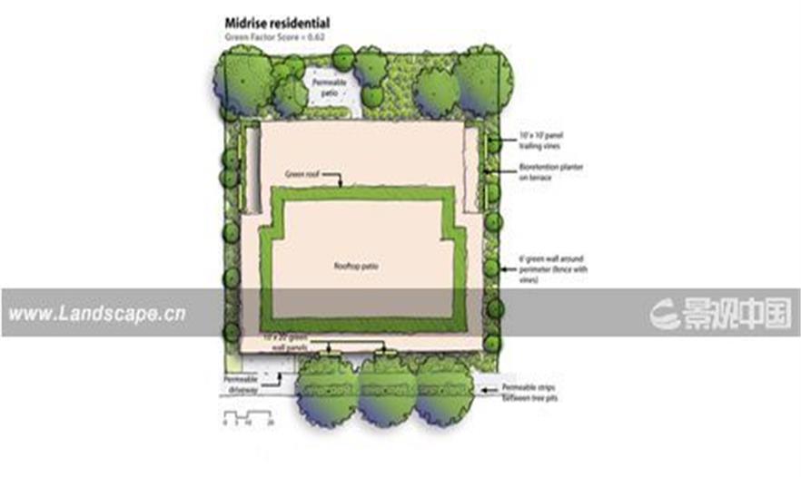 项目概述:西雅图绿色因子(SGF)是为增加城市景观质量创新发展的设计标准。受欧洲先例影响,规划者发明了一个评分体系以鼓励有吸引力和生态功能的景观,包括比如绿色屋顶和墙体、透水铺装、树木保护和粮食生产。SGF被西雅图于2006年采纳、2009年进行了拓展,它激发了全国各市进行相似标准的研究。