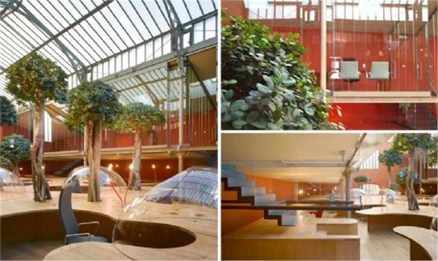 结构体的“最上层”分布了一些曲线形的玻璃罩,它们与木平台分离,共同形成了一条蜿蜒的小路。这个设计将各个单元办公桌有机的布置在一起,同时为使用者提供了独特的视角和环境定位。半圆形的有机玻璃罩还有助于隔音,减少职员间相互干扰。ficus panda 树分散的种植在整个空间中,让办公室看起来更像一个茂盛的花房而不是一个单调的公司机构。18.3 m3 的泥土埋在木结构下方,同时还将电脑传送系统,供热设备和空调及水系统布置在最下方。